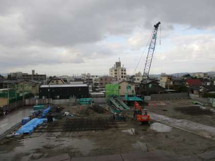 敷地西側では、大きなクレーン車を使って杭打ち作業が行われています。地中深くまで穴を掘り、その穴に、ミキサー車が運んできた生のコンクリートが流し込まれています。