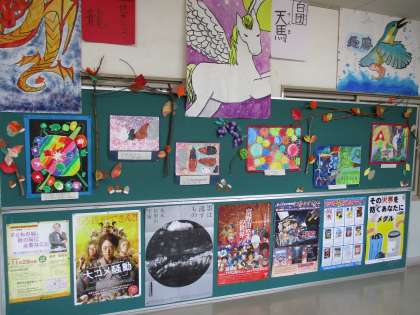 東玄関の掲示板は、秋の装いです。子どもたちの力作が掲示されています。