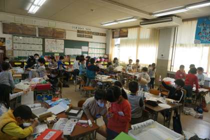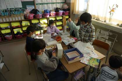 算数科「かたちあそび」の学習をしています。今日は、子どもたちがおうちで用意してもらった空き箱や筒を使っていろいろな物を作りました。