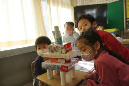 「細長いものを積んでタワーを作りたい」と話す子どもがいたり、実際に作った城のような建物の工夫として、「空き箱を、縦にするとふらふらするから横にした」と話す子どもがいたりしました。それぞれが様々な「かたち」を使って遊ぶことができました。