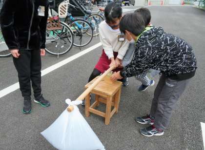 今日は、重たい砂袋をどうやったら軽く持ち上げることができるか、実験を通して考えました。木の棒に袋をひっかけ肩に担いでみたり、角材を支えにして木の棒を押してみたりと、ファミリーの仲間と相談しながら、いろいろと試していました。