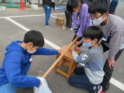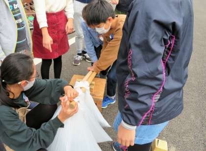 支えにする角材と砂袋の位置、手で押す位置の関係によって、持ち上げる時に感じる重さが変わることに気付いた子どもたち。これから、どのような「てこのはたらき」を見付けていくか楽しみです。