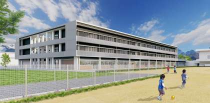 直線が際立つ美しいデザインの校舎で、西側は教室棟になる予定です。