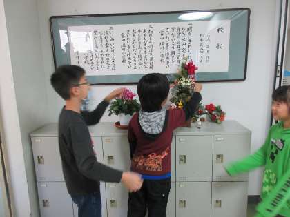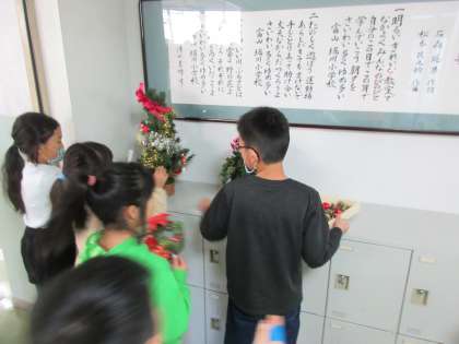 クリスマスの飾りつけ(3年生) 公開日 2020/11/18 更新日 2020/11/18 3年生 朝活動で特別教室を担当していた子どもたちが、学校のクリスマスツリーの飾りつけを任されました。これまでは中央階段に飾られていたクリスマスツリーですが、今年は東玄関に飾ることになりました。子どもたちは、どこに何を置けばいいかを仲間と相談するなど、楽しんで取り組んでいました。