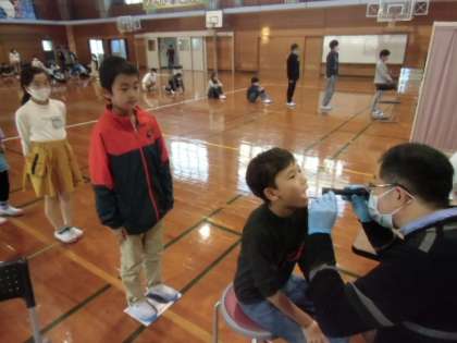 今年度、初めての歯科検診。三密を防ぐために体育館で行いました。待っている子どもたちも、ソーシャルディスタンスを心がけていました。