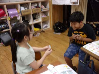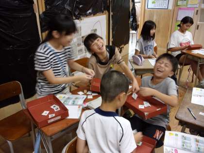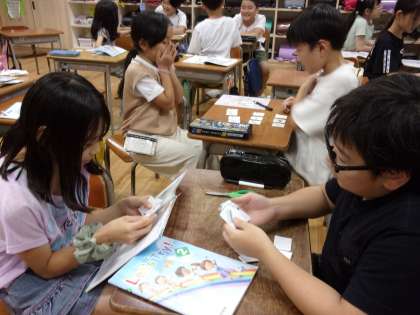 外国語活動では、自分の筆箱にどのような文房具を入れる考え、ペアやファミリーの仲間が何を入れているか英語で聞き合う活動を行いました。相手が何を入れているかを当てることを楽しみながら英語に親しむ子どもたちでした。