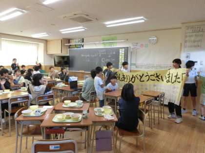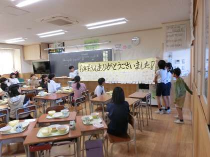 運動会でたくさんお世話になった6年生さんに全校の青団で寄せ書きをして感謝の気持ちを伝えてきました。6年生も拍手をして喜んでくれました。