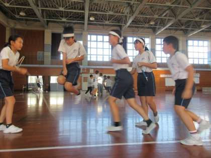長縄跳びに取り組む子どもたちです。練習の様子を動画で撮り、チームで見返したり話し合ったりしながら、自分たちでよりよい取組にしようとする姿が見られます。