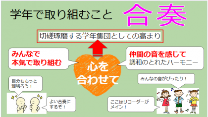 学年目標「切磋琢磨」を目指し、学年集団としての力をさらに高めていくために、学年合奏に取り組みます。一人ひとりの心を合わせ、みんなの力でよい演奏をつくり上げていきます。6年生のさらなる成長が楽しみです。