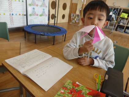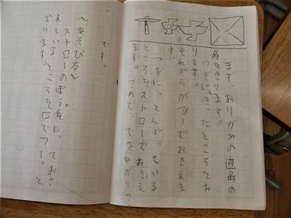 前に作ったことのある おもちゃ「折り紙風車の作り方」の説明文を書きました