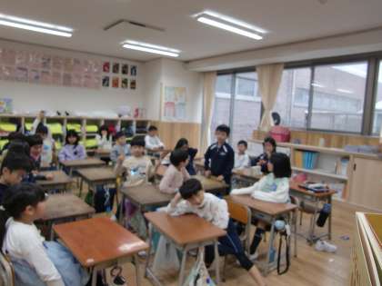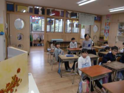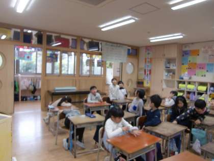 読み聞かせの後の振り返りでは、「いすの近くに来た動物たちは、おいてある食べもをおいしそうに食べて次来る動物のために、自分が持っていた食べものを置いて帰り、みんなやさしい。」といった感想が伝えられました。このお話を通じて、仲間を思いやる気持ちが一段と高まりました。