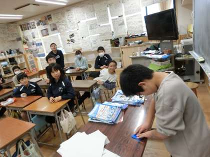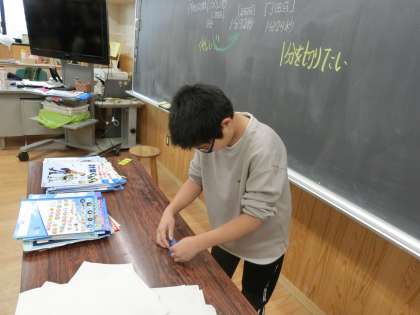 鶴を速く折りたい(5年生) 公開日 2024/12/13 更新日 2024/12/13 5年生 ある日のくらしの時間でギネス大会について話すAさんは「ギネス記録よりも速く鶴が折れるようになりたい」と話していました。仲間から「折るのを見てみたい」と言われて、実際にタイムを計りながら折ってみるとギネス大会より速く折ることができました。「1分は切れるようになりたい」と更に意欲を話していました。