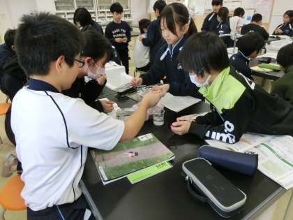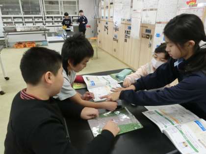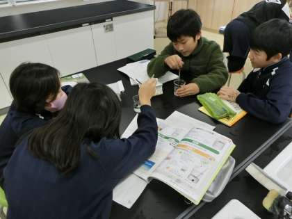 食塩とミョウバンではどちらが多く水に溶けるか実験をしました。「食塩も後半になると溶けずらいよ」「ミョウバンは全く溶けない」等、違いを観察しながら実験をすることができました。