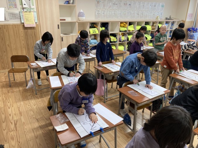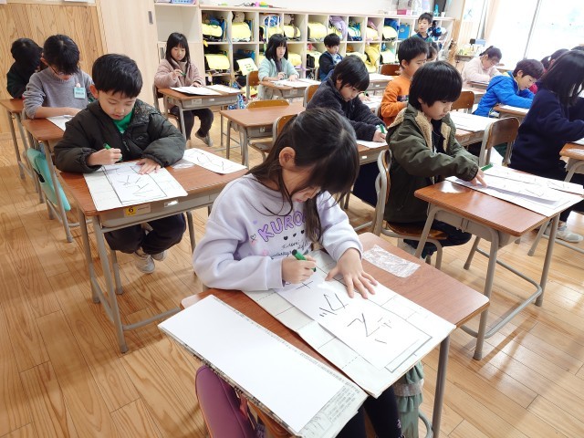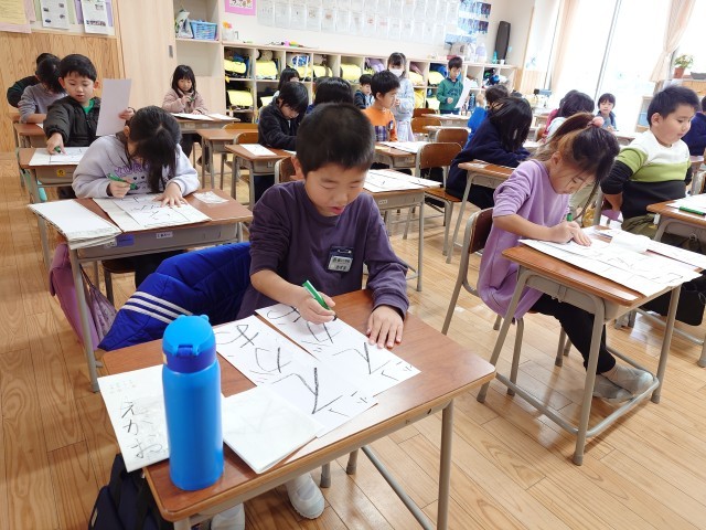 初めての書初大会(1年生)~その2~ 公開日 2025/01/09 更新日 2025/01/09 1年生 物音を立てることすらためらわれるような真剣な表情で、本番の紙と一人ひとりが向き合っていました。 書き終えた後に、静かに何度も頷く子どもや、小さくため息をつく子どもなど、様々な反応を行っていました。 自分の目指す姿を思い浮かべながら、冬休みの間に一生懸命に練習を重ねてきたことがよく伝わってきました。