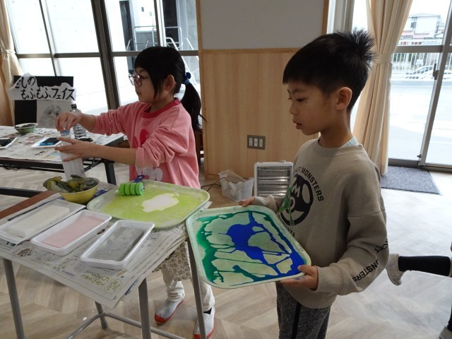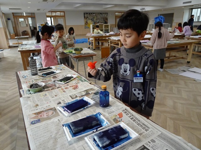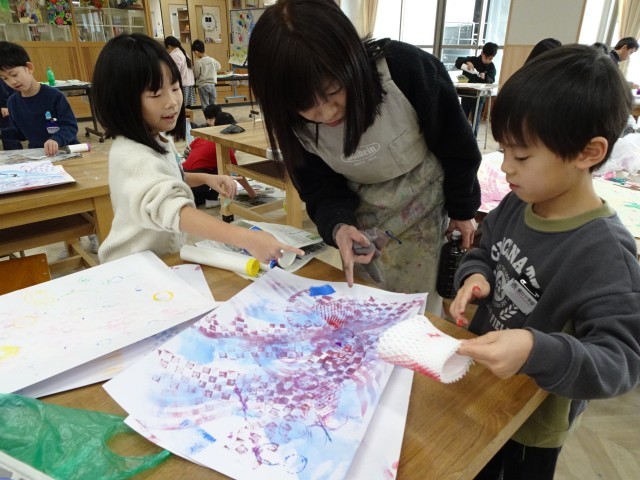 ペタペタペッタン(1年生)~その1~ 公開日 2025/01/28 更新日 2025/01/27 1年生 図画工作科の学習で、先週はコロコロローラーをしました。 今週は、コロコロローラーをした画用紙の上から、身の回りにある様々な物や容器に、絵の具をつけて、ペタペタペッタンと模様を付けました。 「想像してたのと違う形だ!」 「重ねて付けたらいい感じ」 ペタペタペッタンと夢中で自分の作品と向き合っていました。