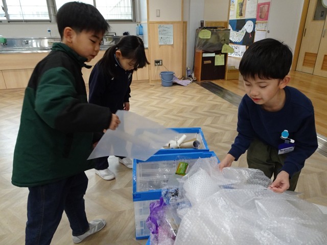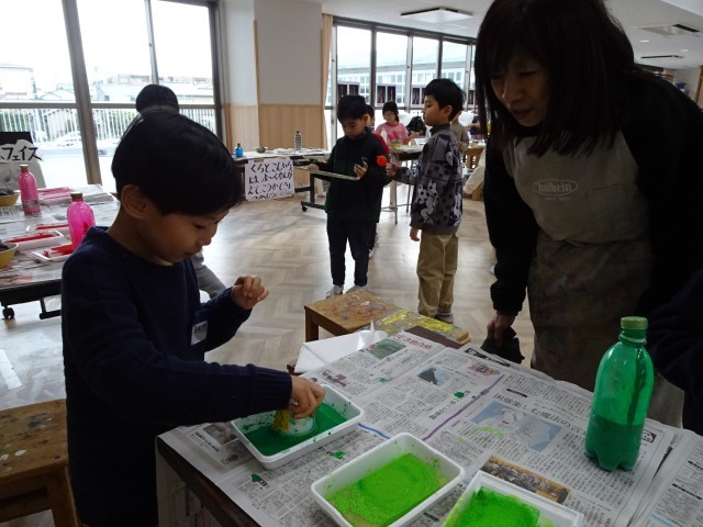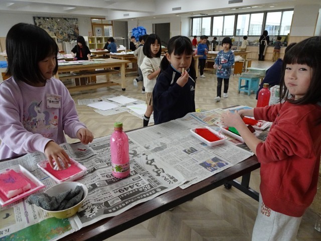 ペタペタペッタンと、いろいろな容器を絵の具につけて、納得のできる作品を作り上げていました。