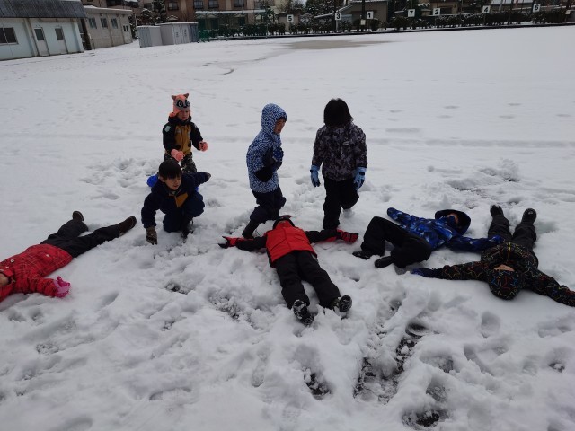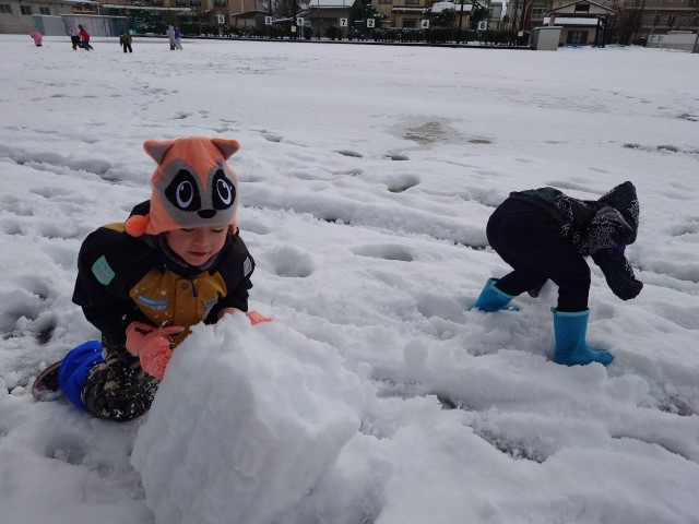 雪をもって「冷たい!」と言ったり、「雪の布団だ」と言って雪の上で寝たり、重い雪玉をみんなで押すなど、楽しそうに雪とふれあっていました。