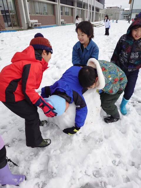 久しぶりに、まとまった雪が降り、校庭にもこんもりと雪が積もりました。