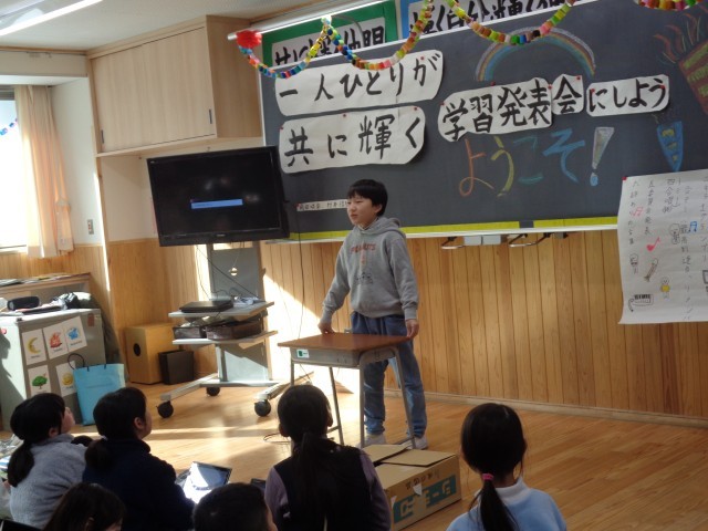 2月8日(土)に、学習発表会が開催されました。一年間の学習の成果を堂々と発表する姿がたくさん見られました。学習の中で頑張ってきたことを、スライドや実物をもとに伝えたり、劇を交えて1年間のクラスの様子を紹介しながら個人発表をしたり、これまで学習してきたことをもとにクイズをつくって会場を和ませたりする等、それぞれの学級の個性を活かした発表会でした。学校のあちらこちらで、温かい拍手が響き、心地よい緊張感と和やかな雰囲気が広がっていました。