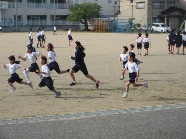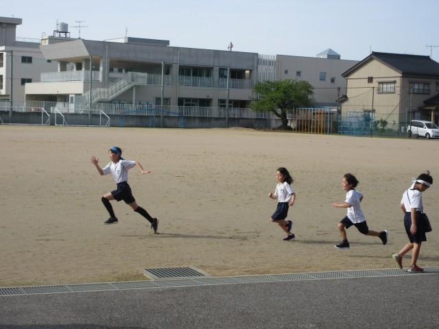 登校後、準備を済ませ、すばやく体操服に着替えた1年生。今日から、5年生と一緒にグラウンドで走りました。「走るの楽しい!」「明日も一緒に走りたい!」と笑顔で話す1年生を見て、5年生も嬉しそうでした。