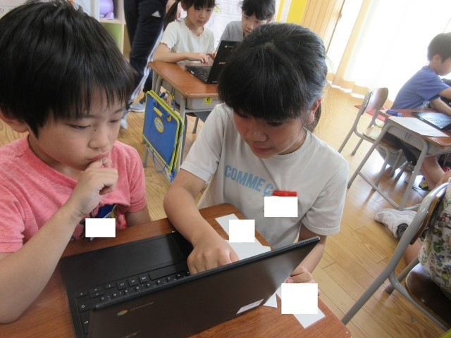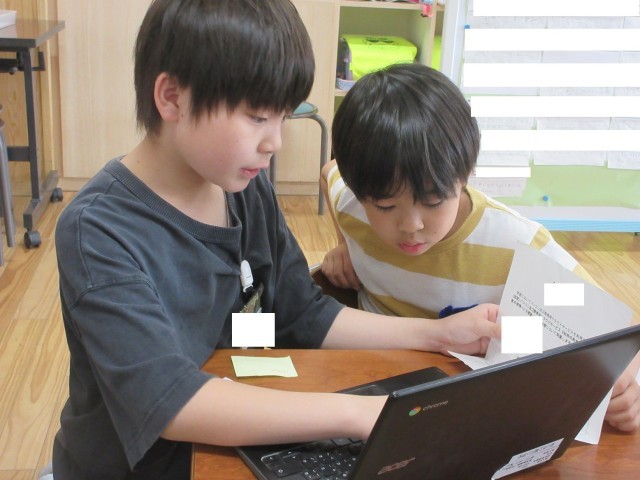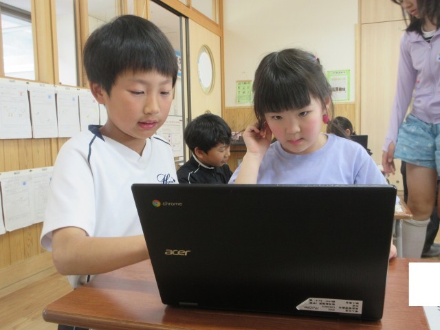 1年生にクロームブックの使い方を教えました。1年生に優しく声をかけて手順を丁寧に教えたり、「数字は自分で入力してみる?」などと1年生が自分でできた喜びを味わえるように声をかけたりする姿が見られました。温かい関わり方がすてきです。
