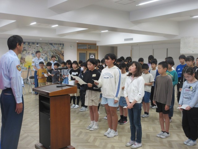 富山消防署の方々にお越しいただき、BFCバッジ授与式と防火防災教室を行いました。バッジをいただいたことを契機に、少年消防クラブ員としての自覚と誇りをもち、防火意識を高めた子どもたちでした。
