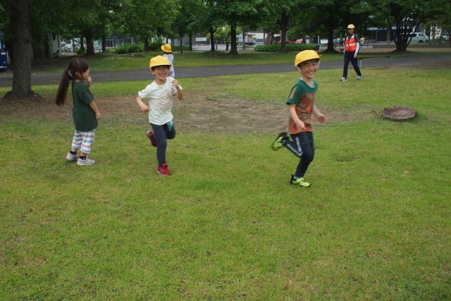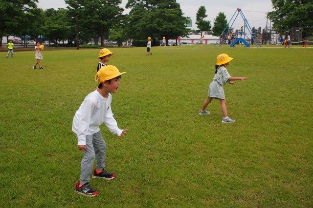 布瀬南公園に着くと、子どもたちの到着を待っていたかのように晴れ間がさしました。ファミリーで事前に決めた遊びをしています。鬼ごっこやかくれんぼなど、広い場所でのびのびと遊びました。