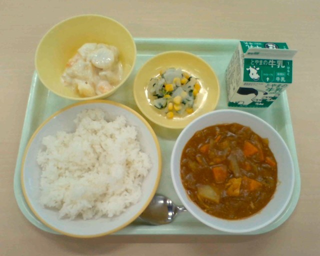 4月10日(金)の給食チキンカレーライス、牛乳、水菜のサラダ、フルーツヨーグルト...