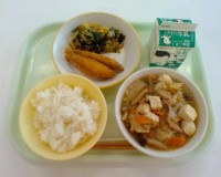4月13日(月)の給食ごはん、牛乳、わかさぎのフリッター、わかめのチョナムル、肉...