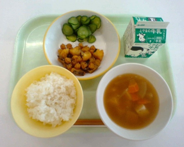 4月14日(火)の給食ごはん、牛乳、ホキとひよこ豆の甘からめ、きゅうりもみ、けん...