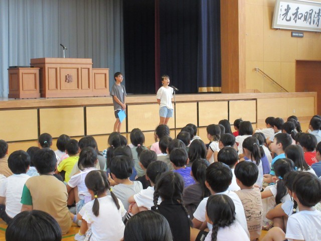 73日間の1学期が終了しました。終業式では全校児童800人近くの前で、3年生の代表児童が堂々と1学期楽しかったことを発表することができました。聴いている態度も立派でした。教室では夏休みの生活の注意を聞いたり、あゆみをもらったりして落ち着いて過ごすことができました。