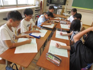 今日は、宿泊学習の班ごとに話し合ったり、算数科で相似な図形を探したり、夏休みの作品を発表し合ったりしました。