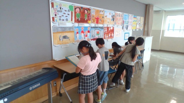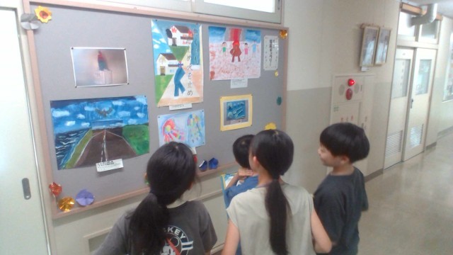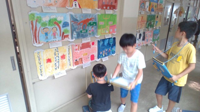 3年生の図画工作科の学習では、各クラスで描いた作品の表情や色の使い方、描いてあるものなどに注目して鑑賞しました。「僕もここに行ったことがあるよ」や「ここに行ってみたい」と楽しみながら鑑賞していました。