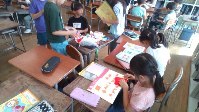 クラスのみんなに楽しんでもらえるように、係ごとに活動内容を考えて取り組んでいます。イラストを描いたり、くじ引きを作って、その景品を折り紙で作ったりしています。