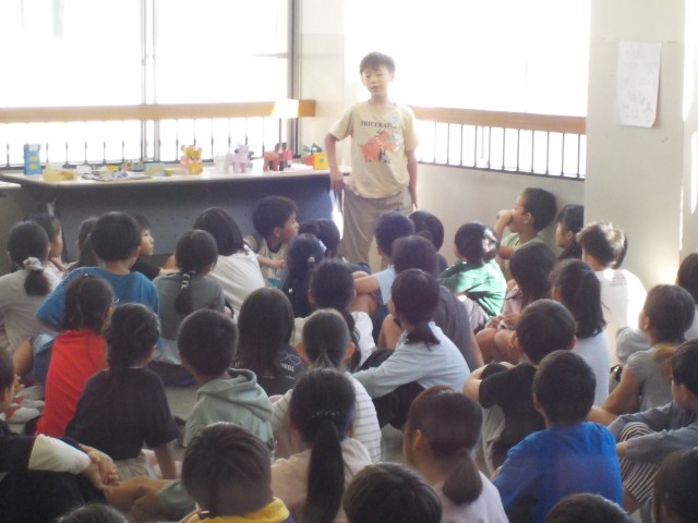 青鬼が手紙を書いているときの気持ちや、手紙を読んだ赤鬼がどんなことを言ったのかを考える中で、たくさんの3年生が発表しました。途中に周りの友達と話し合うことで、全員がしっかり自分の考えを伝えていました。ある子が「最後の手紙に『ぼくのこと忘れないでほしい』って書いてあったよ」と言うと、自然と劇で歌った合唱曲を口ずさむ子供たち。その姿に進行役の私がうっかり泣いてしまったことは内緒です。様々な考えが飛び交う1時間となりました。