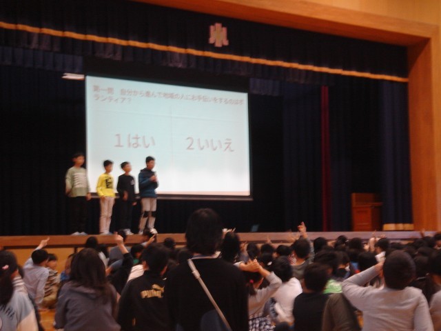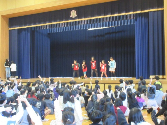 イントロクイズ、カーテンクイズでは、縦割り班ごとにみんなで相談し合って、クイズの答えを考えていました。ボランティア委員会の発表では、赤い羽根共同募金についてのクイズに答えながら、理解を深めることができました。最後に今月の歌「おはようのエール」を全校で歌いました。縦割り班で楽しく活動することで、より仲を深めることができました。
