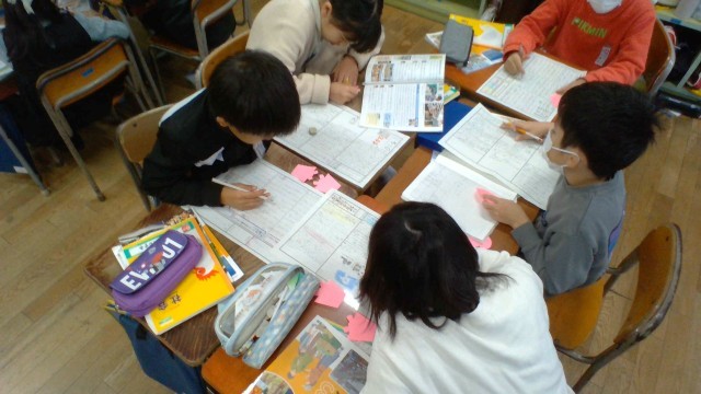 社会科ではスーパーマーケットで働く人について学習し、学んだことを新聞にまとめました。一人ひとり着目しているところが違うので、興味深く友達の新聞を読んでいました。友達の新聞の工夫やよいところを付箋に書いて渡しました。友達からほめてもらい嬉しそうな子供たちです。
