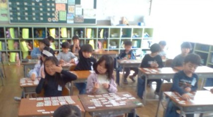 算数科では、繰り上がりのたし算の学習をしています。計算カードを使って少しでも早く答えられるように練習しています。