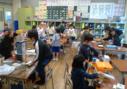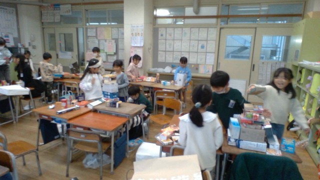 箱などの身の回りにある物を使って、いろいろな形に組み立てました。