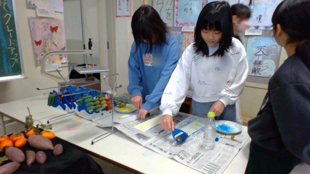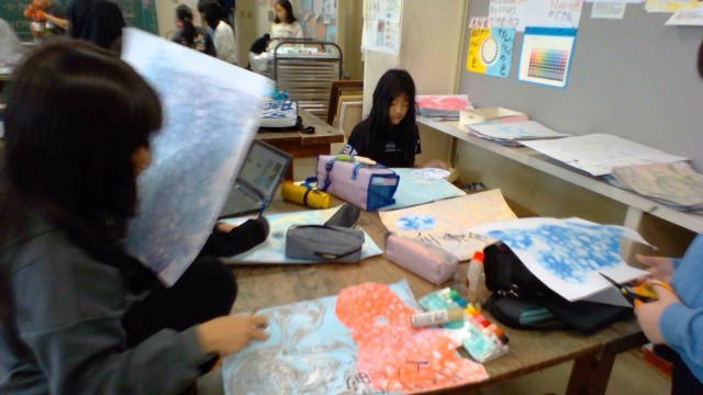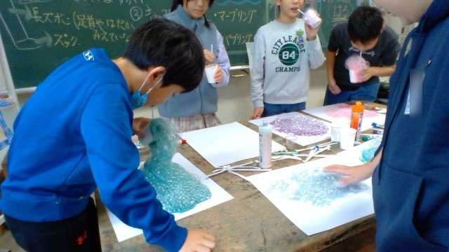 絵の具の泡、スタンプ、マーブルリング等で、自分の好きな言葉を表現しています。