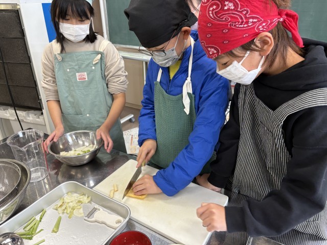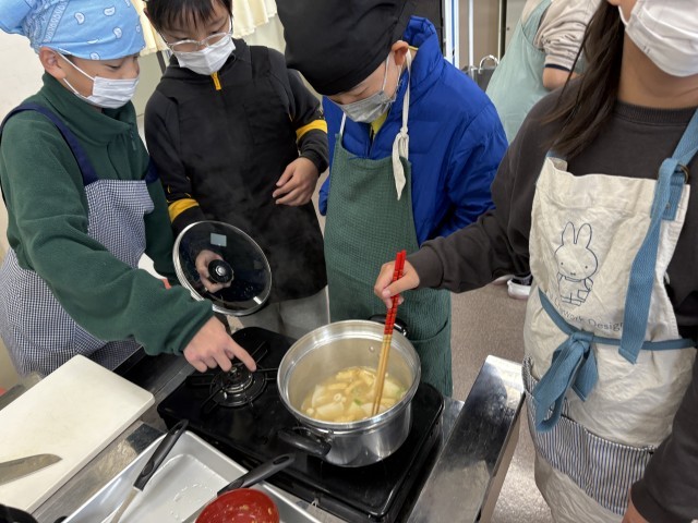 今日は調理実習をしました。どの班も宿泊学習で培ったチームワークを生かして、おいしいみそ汁を作りました。