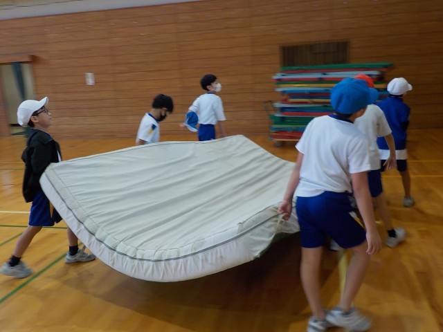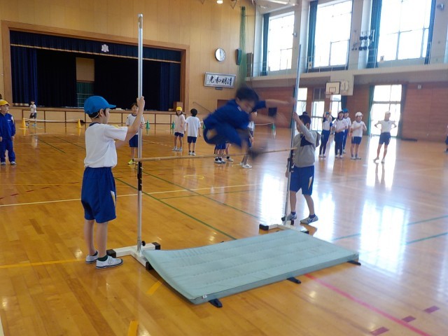 体育の時間には高跳びを学習しました。最初は、なかなかこわくて跳べなかった子供たちですが、練習を重ねるうちにきれいなフォームで跳べるようになりました。学習の後は、みんなで協力して片付けをする様子も見られました。