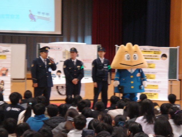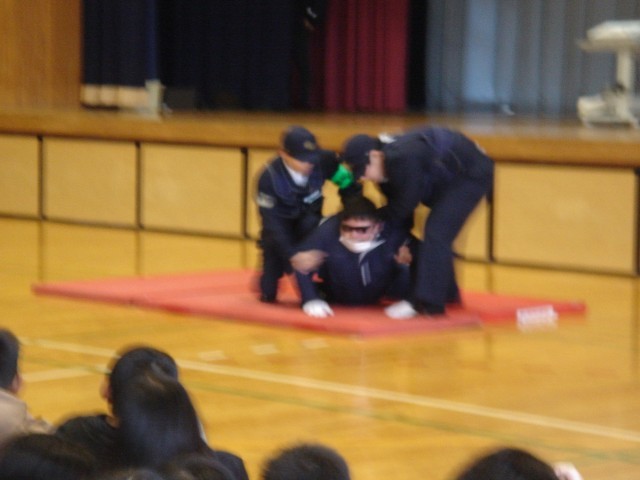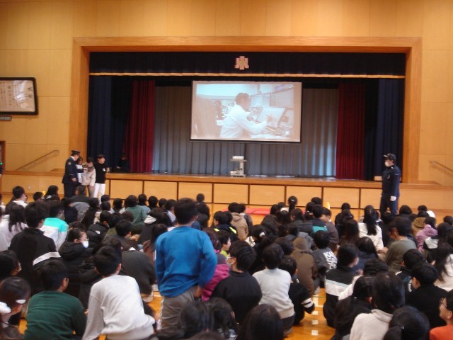 3時間目に4、5、6年生対象に「正しい110番のかけ方教室」がありました。富山南警察署の警察官の方から、始めに110番をかけるとどのように警察署の通信指令室につながるかや、正しい110番のかけ方を教えていただきました。次に、不審者の絵を見ながら連絡する練習をしました。最後に、実際に不審者に変装した警察官が学校に侵入してきた想定で、110番し、通信指令室とライブ配信しながら不審者の特徴を伝えるシュミレーションをしました。