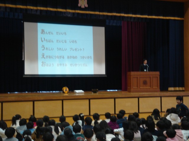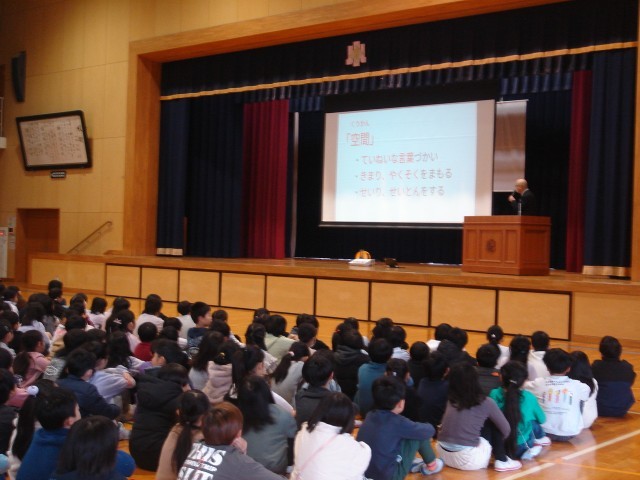 始めに校長先生の話を聞きました。そして「時間、空間、達成感」について、時間を守れたか、言葉や身の回りの整理整頓ができたか、学習や係の仕事などをしっかり出来たかどうか自分たちの2学期の生活を振り返りました。次に、2年生、4年生の代表が2学期がんばったことについて発表しました。終業式の後、冬休みの過ごし方についての話を聞きました。