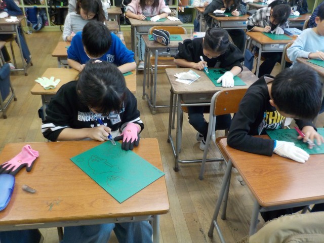 3年生の図工では版画に取り組んでいます。初めて彫刻刀を使う子供たち。真剣に取り組んでいました。