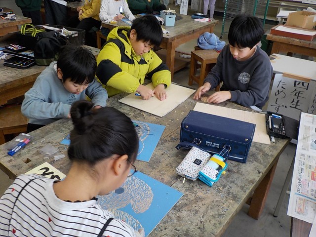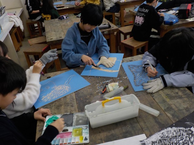 図画工作科の時間には、「もふもふのお顔」と題し、動物の顔を版画で作成しています。平刃や丸刃等を使い分けて、表現したいものに近付けようと、集中して版を作っています。作品は学習参観の際に掲示する予定なので、お越しの際にはぜひご覧ください。