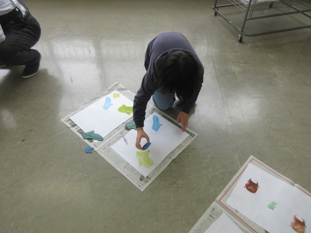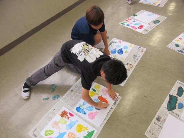 教材屋さんにも手伝っていただき、一生懸命印刷しました。苦労して彫ったゴム版が色とりどりの絵となり紙に写しだされると自然と子供たちの口からは歓声があがっていました。一人ひとりお気に入りの作品が出来上がったようで、満足げな顔の子供たちです。2組と3組は明日行います。