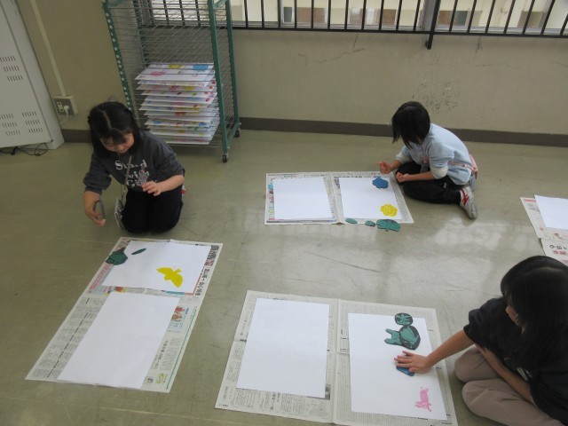 3年生の図工では版画に取り組んでいます。今日はいよいよ彫刻刀を使って彫ってきたゴム版を使って印刷です。