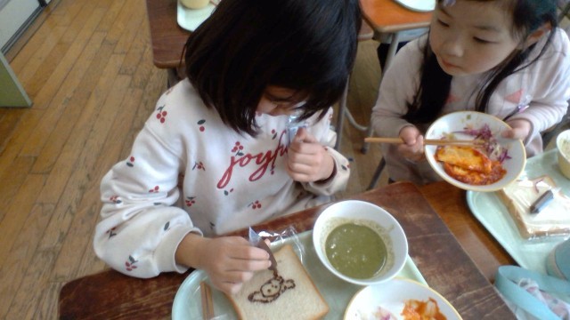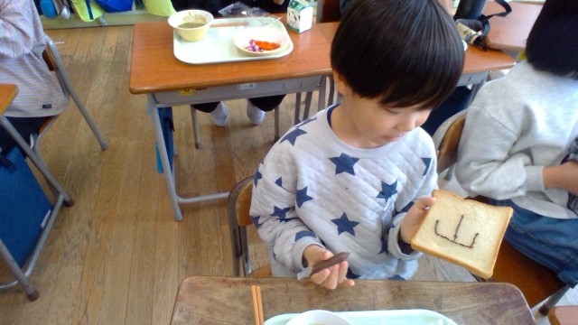 今日は図工のカラフル献立。チョコペンでパンにお絵描きし、楽しみながらいただきました。