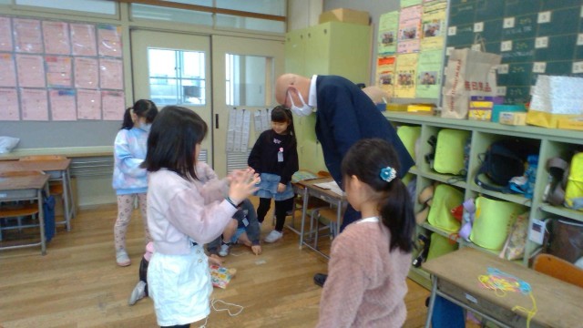 昔の遊び名人を目指して、お手玉やこま、だるま落とし等いろいろな遊びに取り組んでいます。今日は、校長先生にコツを教わりながら楽しく活動しました。
